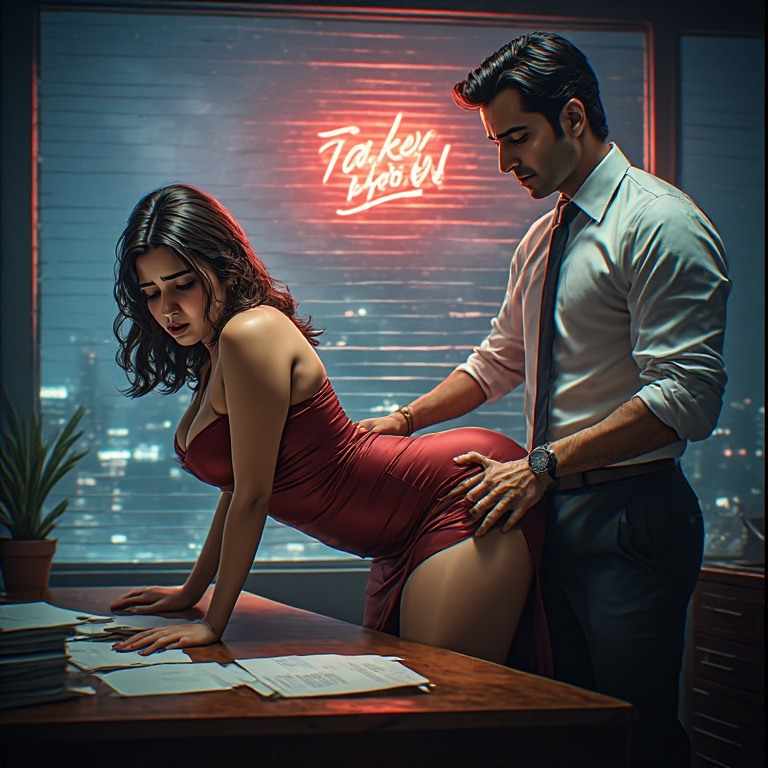 The office was quiet, the hum of the air conditioning the only sound breaking the silence. I, Gowri, was working late, as usual. I was bent over my desk, my skirt riding up slightly, revealing the lace trim of my stockings. I felt a presence behind me, and I turned to see Shankar, my boss, standing there, his eyes locked onto my ass.